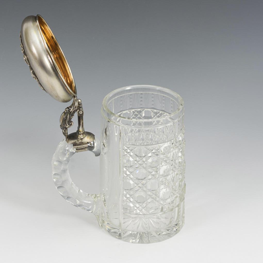Cut beer stein with relief and engraved lid "1869 April 1, 1894. The staff of St. Thomas Church". 1 dent on the front of the lid.
