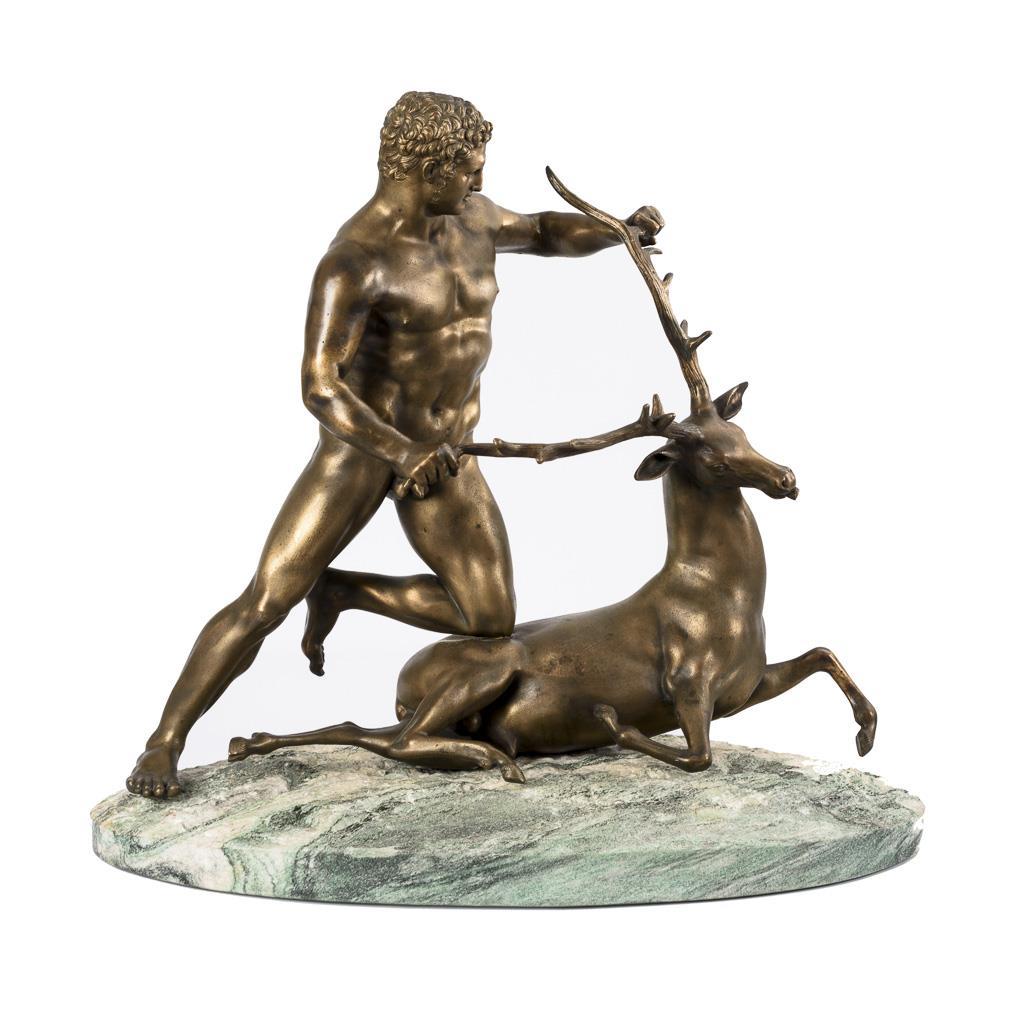 After the large bronze original in the Museum of Palermo designed nude hero of antiquity in battle with the stag. The Roman copy probably of a Greek original in Palermo originally served as a fountain figure. Repairs partly by the foundry, minor hairline cracks, plastered patina, base supplemented and loose.