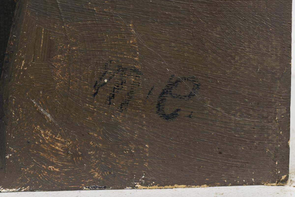 Oil/painted cardboard. Monogrammed lower right, inscribed on adhesive label on verso.