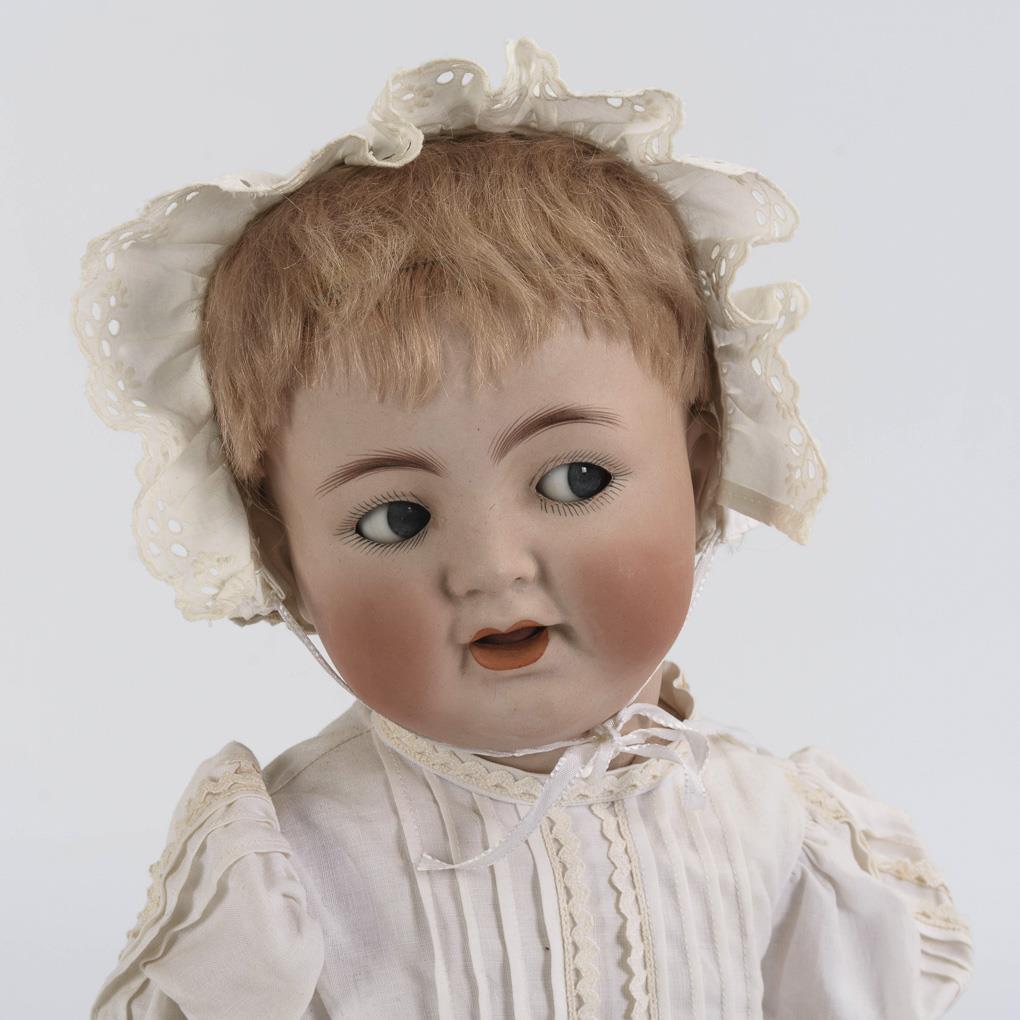 Crank head, blue sleeping/shell eyes, moving tongue, rose blond mohair wig. Light colored, 5-piece sitting baby body with 2-piece torso. White dress, matching bonnet. Head x-rayed: without defects, 1 lid rubbed, voice silenced.
