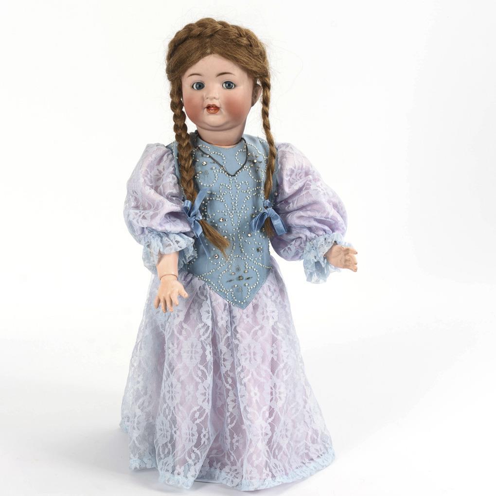 Crank head, blue sleeping/shell eyes, movable tongue, medium blond human hair wig with braids. 15-piece toddler body. Completed blue-purple dress with pearl embroidery, white plastic shoes. Head x-rayed: only 1 chip on the lower lip. Wig with signs of age, 1 finger and 2 toes minimally bumped.
