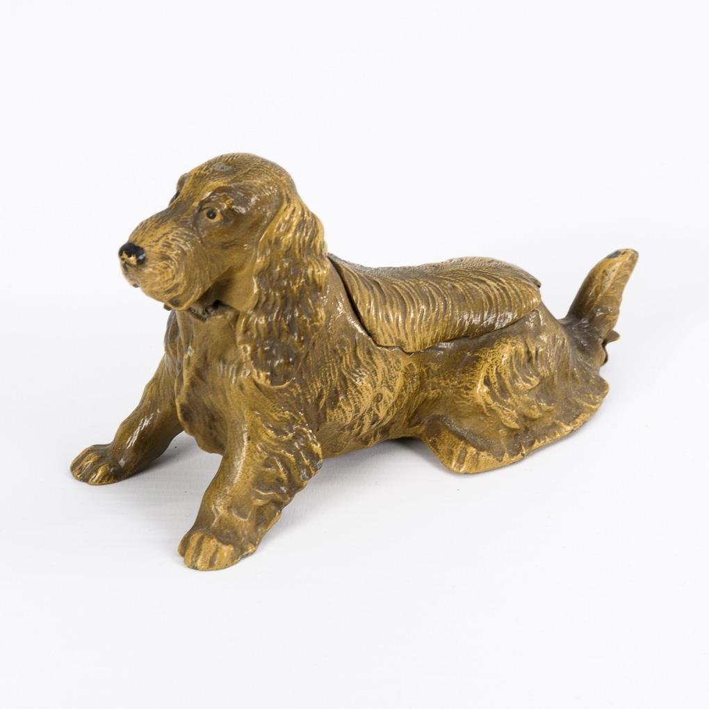 Sitting dachshund. Under the hinged head a hole for matches; under the back flap the ashtray with emptying flap below. Few paint chips.