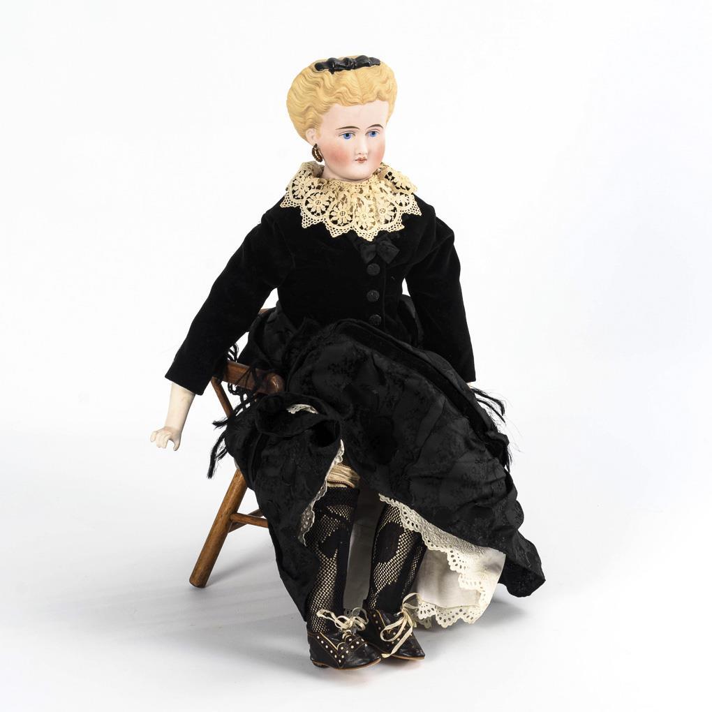 Painted blue eyes, pierced ears, modeled braided hairstyle with black bow. Leather body with rocker limbs, bisque forearms. Waisted black velvet jacket and black skirt with fringes re-sewn, old brown oilcloth shoes. In addition, small chair made of beech wood. 1 earring missing. Leather upper arms renewed.