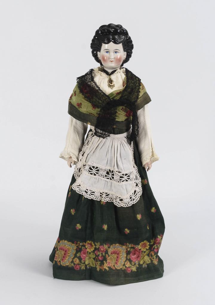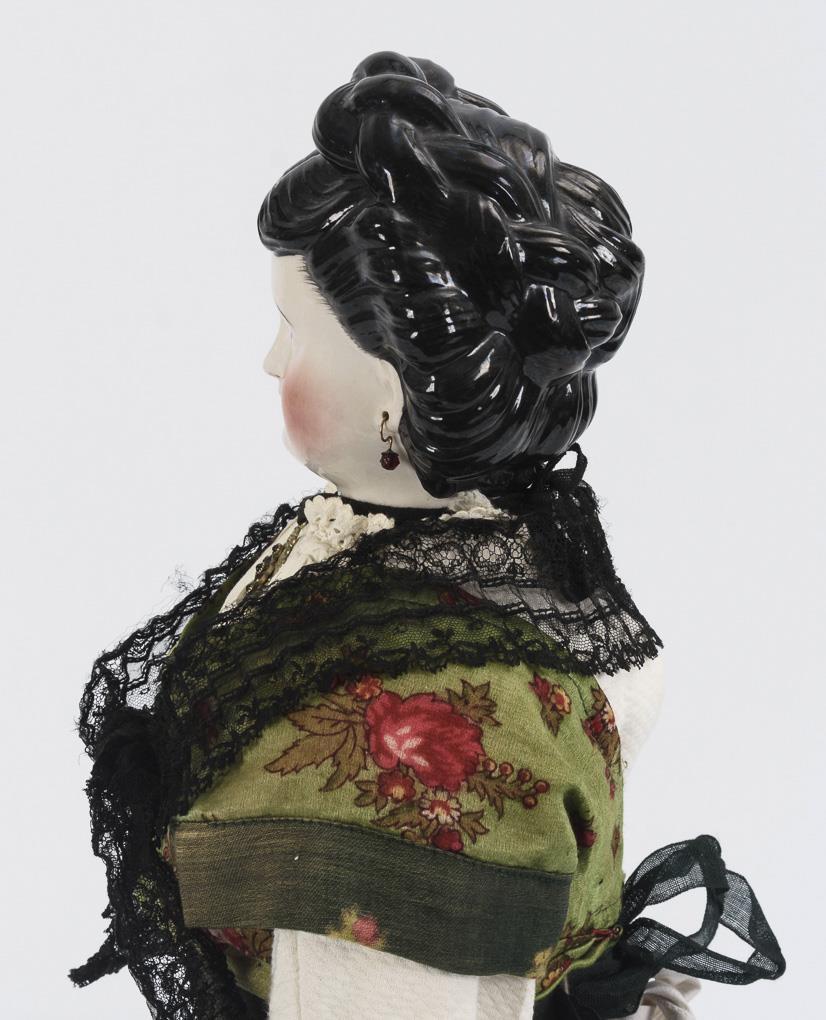 Glazed chest head, painted blue eyes, earrings, black hair with modeled braided coiffure. Leather body with cotter pin joints, bisque forearms. Dressed in traditional costume style, underwear old. No defects visible.