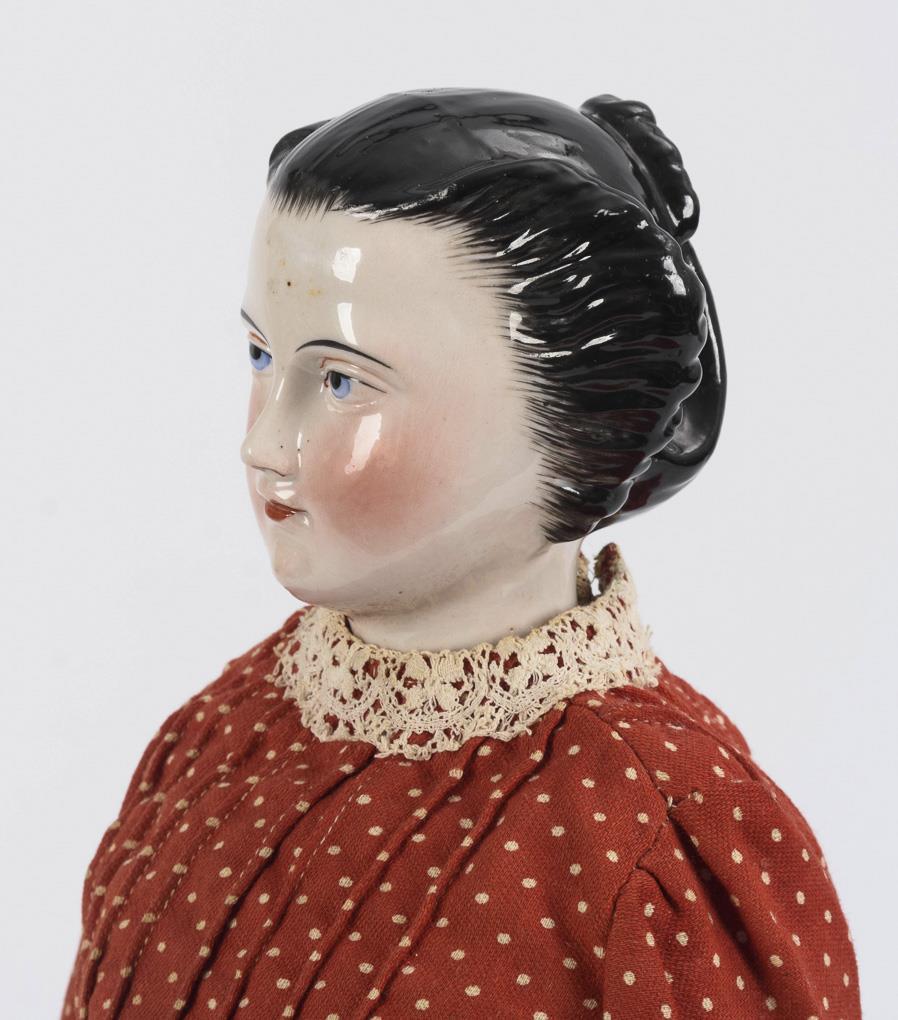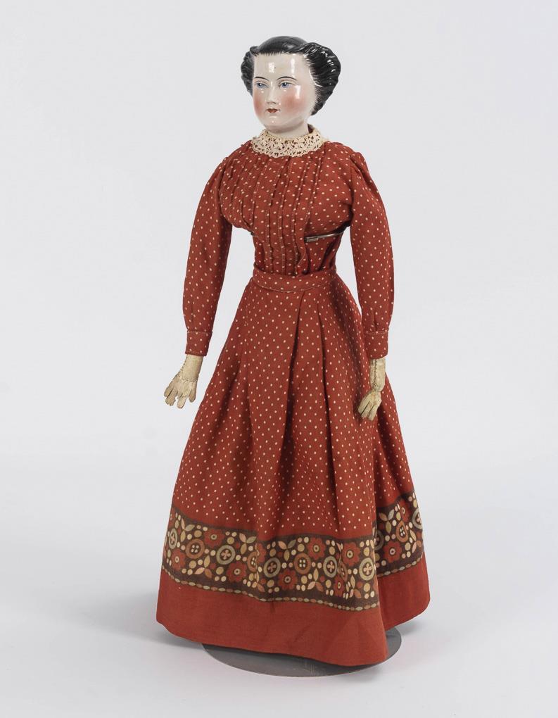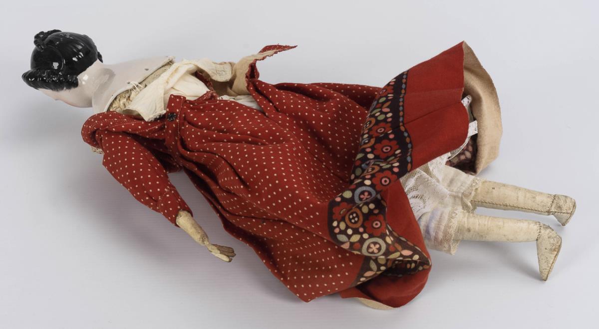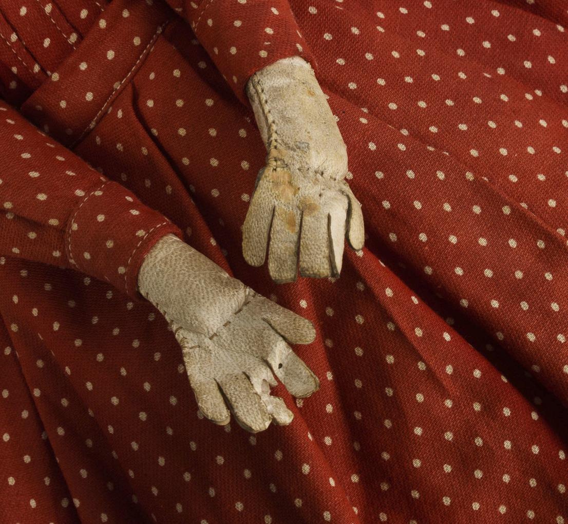 Painted blue eyes, sculpted black hair with clear hairbrush on the sides. Very slim leather body without joints, hands with stitched fingers. 2-piece red dress with white dots, old underwear. Slight signs of age, head without defects.