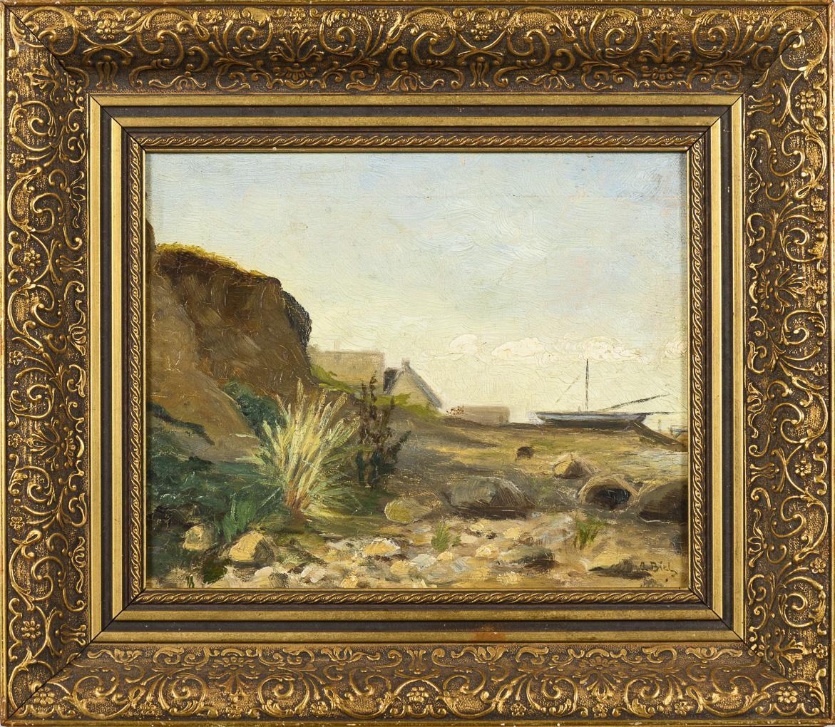 Stony shore with some vegetation as well as view to the village with boat on the beach. Shrinkage cracked.