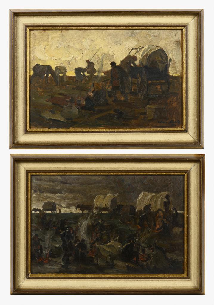Each sweeping painted many-figured people of the camped trek in front of covered wagons (1x bivouac of soldiers in World War 1?). Each soiled.