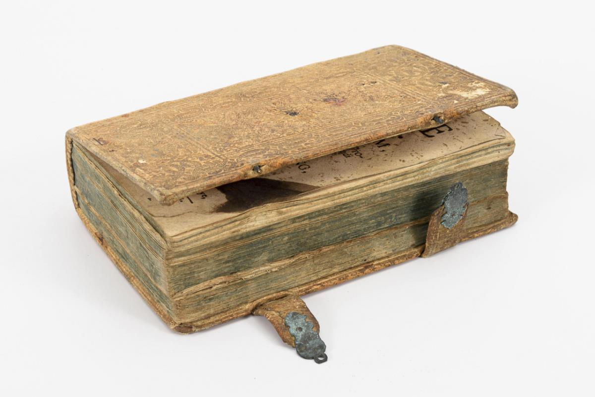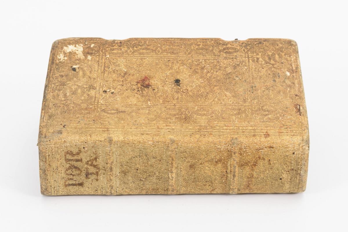 Early Latin textbook with portions of dictionary, grammar, textual examples and proverbs Latin-German. Embossed vellum binding with clasps. Title page stained, handwritten annotations and scribbles, but preservation fine for its age.