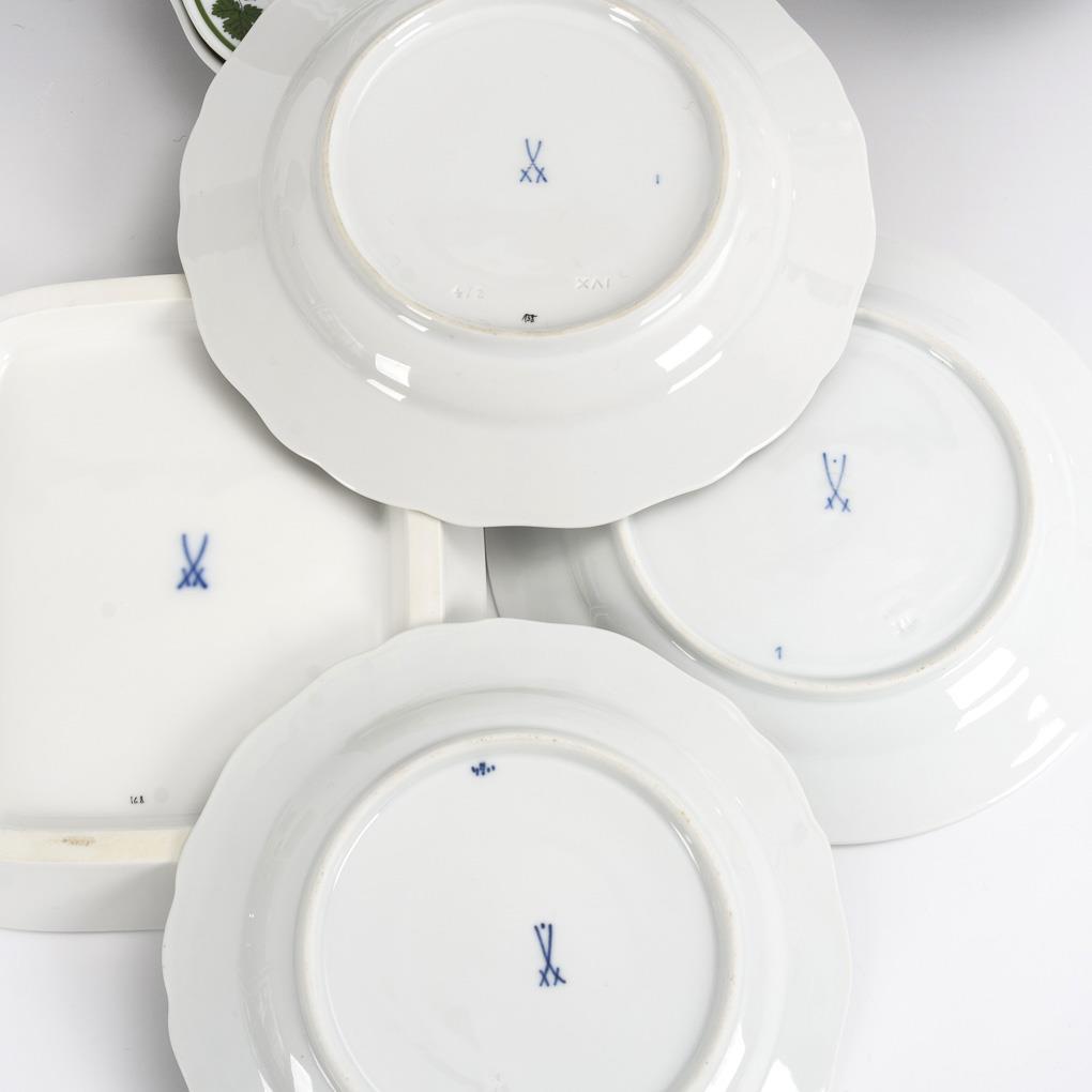 Form "New Cutout" and smooth shape. Coffee pot (H 23,5 cm), oval plate (L 38 cm), 3 +1 +1 plates (Ø 3x 18 cm, 1x 20 cm and 1x 19 cm) and 1 rectangular small plate (19,5 x 16,5 cm).