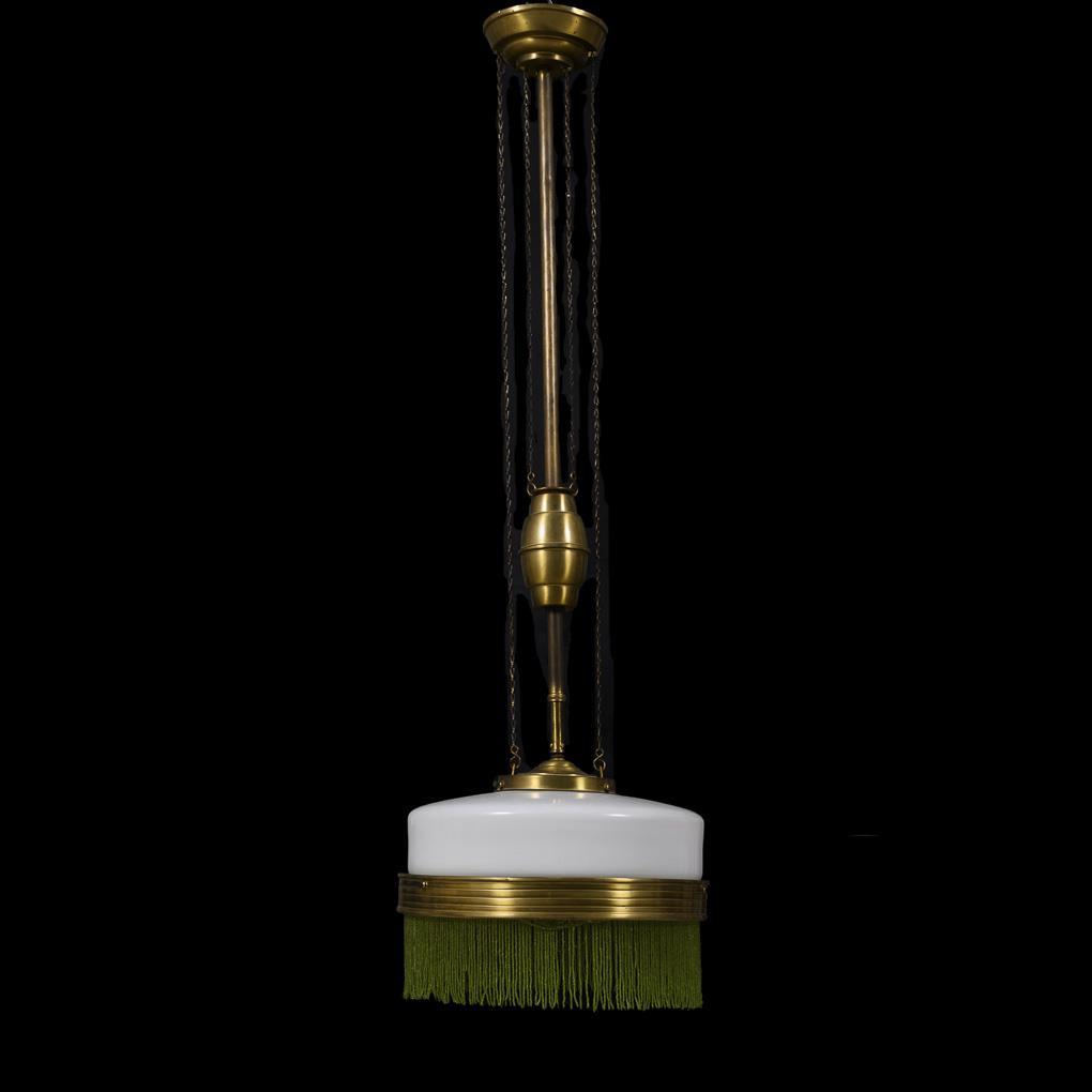 1-light, height-adjustable hanging lamp with center rod and plate canopy, glass shade with brass ring and green bead hanging; individually height-adjustable by double-pull pendulum. Slight signs of age/use, glass rim with small chips, few beads missing.