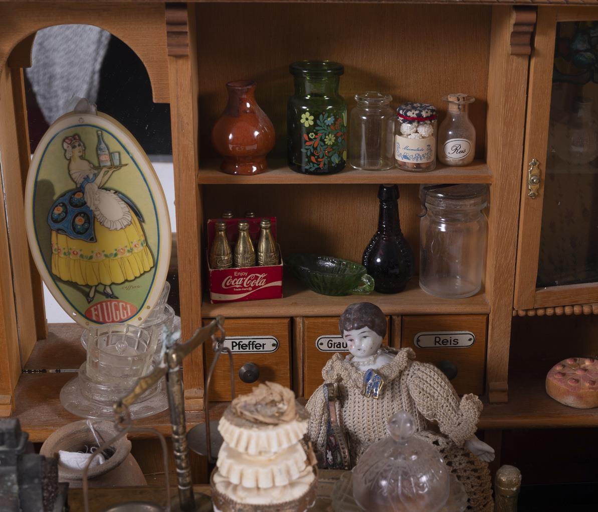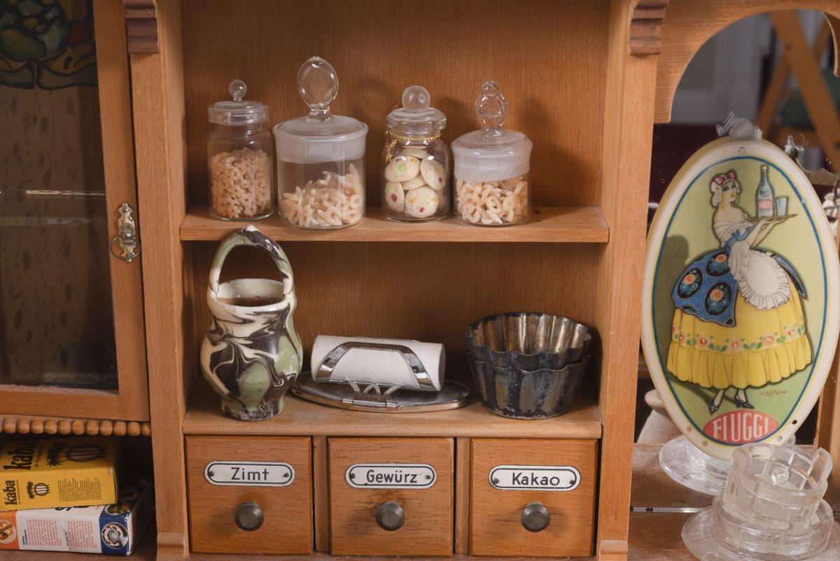 Old style store with loosely set counter, mirrored center compartment, 6 spice drawers and 2 glazed doors. Furnished with baked goods, jars, boxes, bottles, etc. In addition, saleswoman with glazed chest head. Played, small defects.