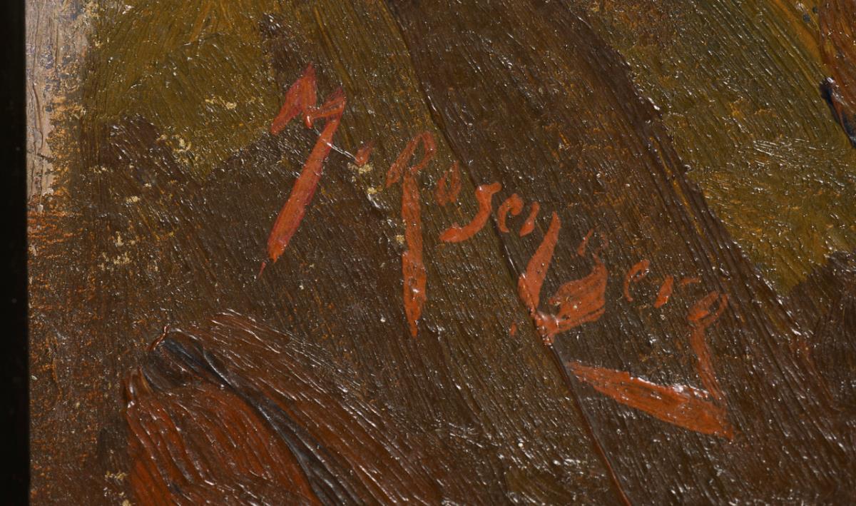 Oil/painted cardboard. Signed lower left.