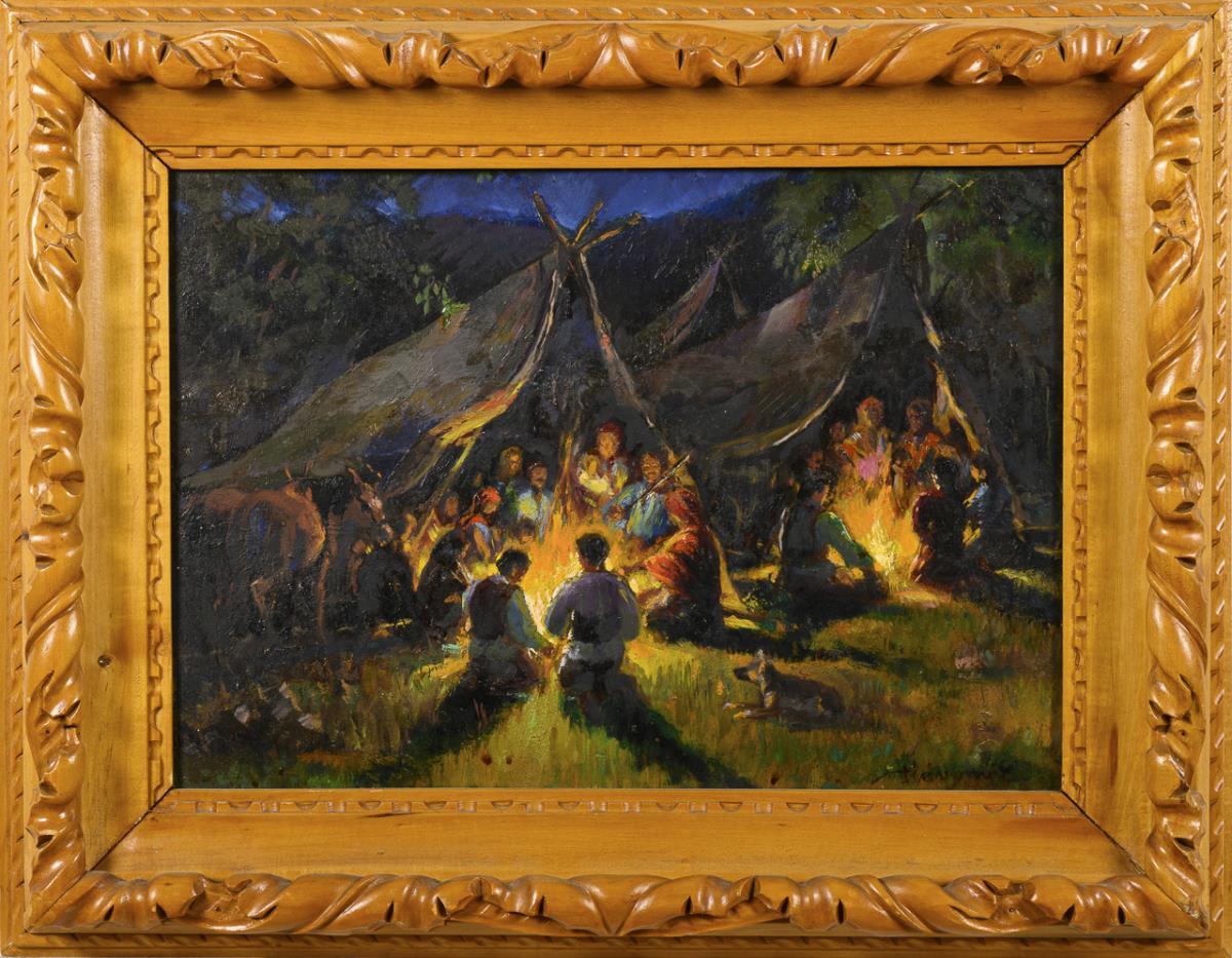 Tent camp with convivial rounds around the campfires. Slight signs of age.
