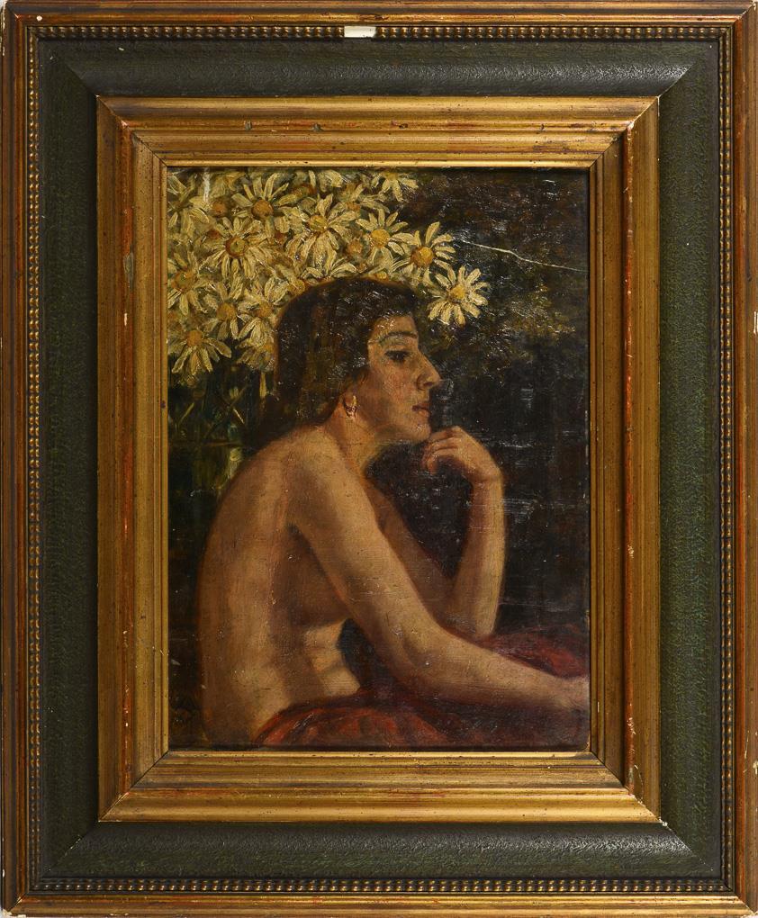 Oil/painted cardboard. Monogrammed lower left. Early 20th century