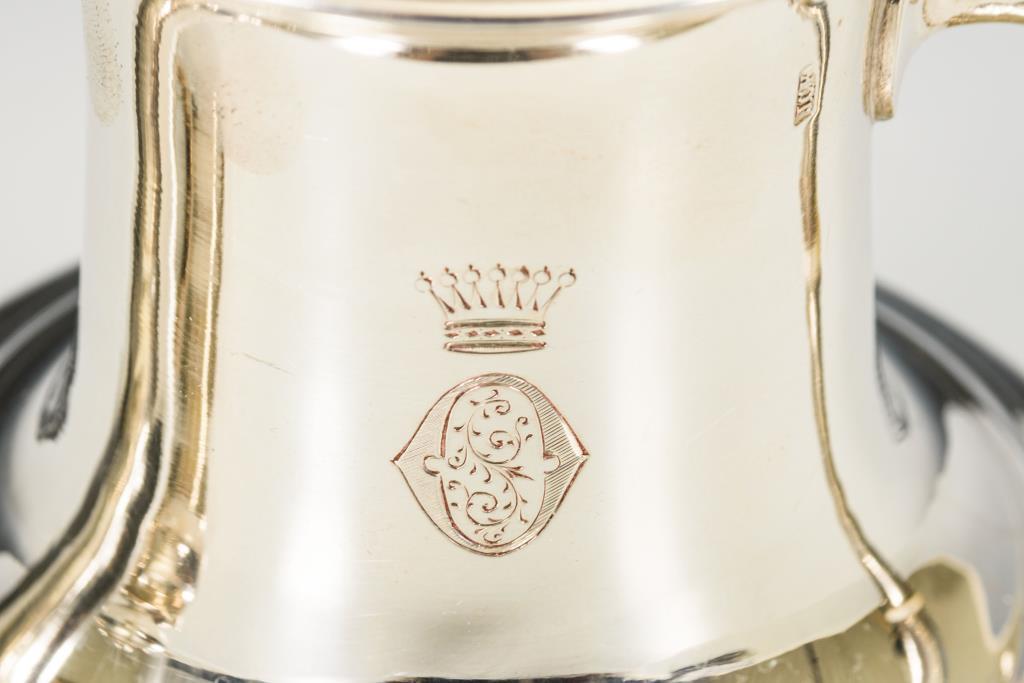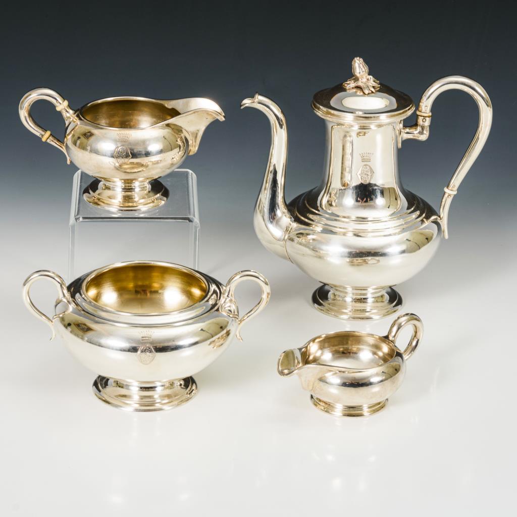 Bauchig-gedrückte Form. Mokkakanne mit Blütenknauf. Kanne, Kännchen und Zuckerschale mit bekrönter Monogrammgravur "OGS". Gebrauchsspuren, kleine Dellen.
