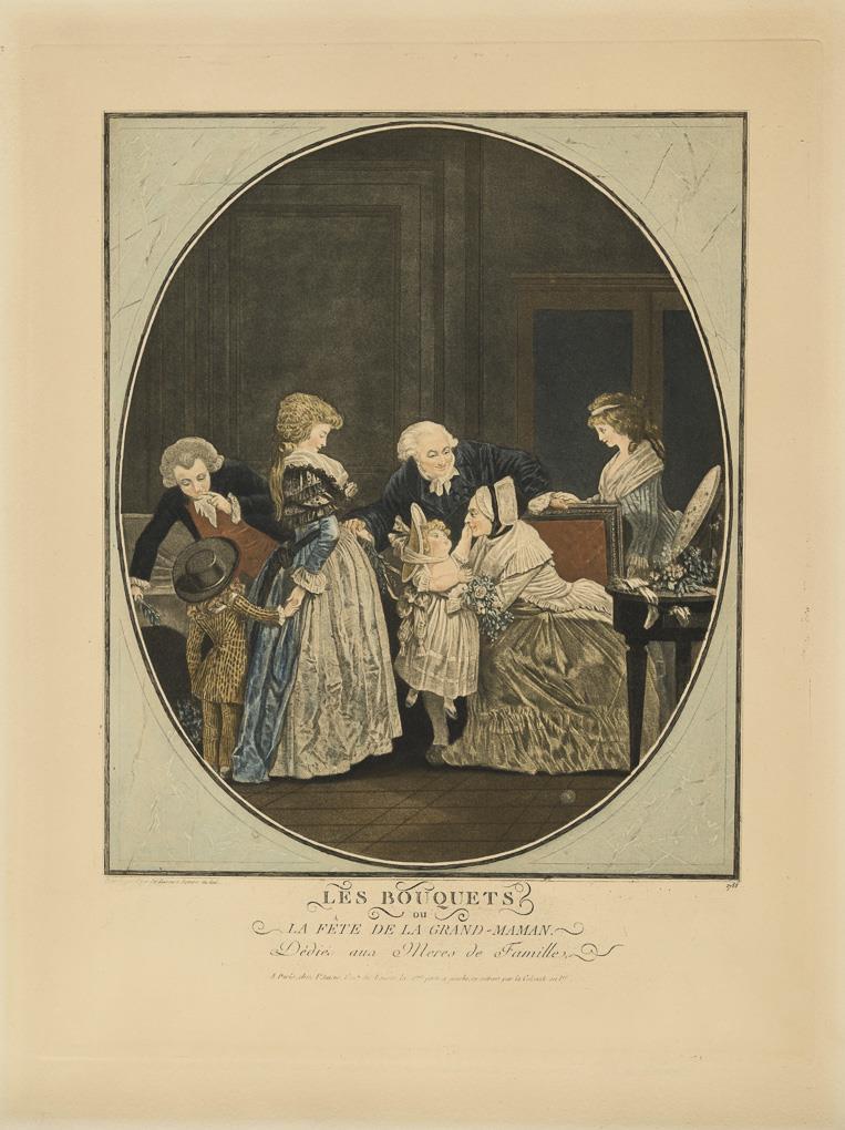 "Le Compliment", plate: 40 x 31 cm, dated in the plate: 1787, inscribed "Le Compliment ou La Matinée du Jour de l'An. dédiee aux Peres de famille [...]" and "Les Bouquets", plate: 40,5 x 31 cm, dated in the plate: 1788, inscribed "Les Bouquets ou la Fete de la Grand-Maman. Dediés aux meres de Familles [...]". Sheet ever browned.