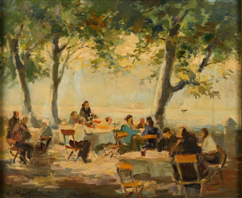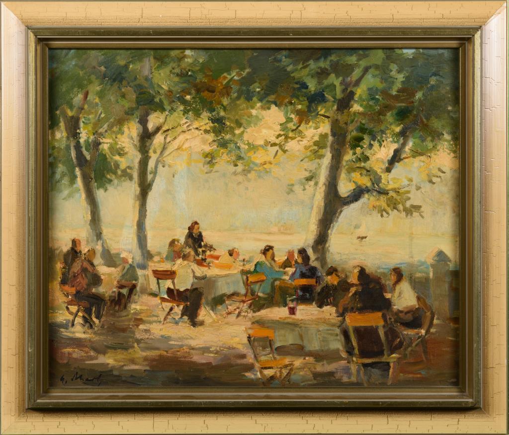 Undeutlich signiert: Biergartenszene am Wannsee