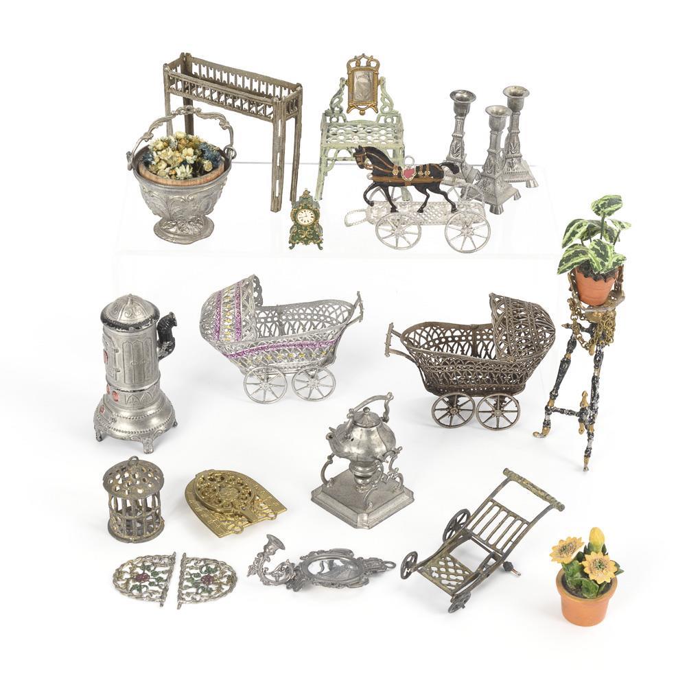 Approx. 18 parts for the dollhouse, including 2 baby carriages, flower stand and bench, stove, mantel clock, candlestick etc. Partly small defects.