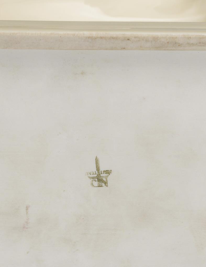 Cream colored, partly gold and red decorated. H 31.5 cm, L 36.5 cm.