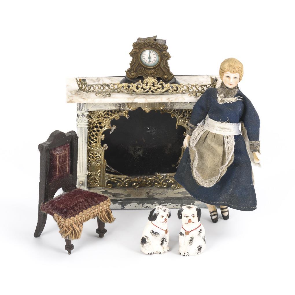 Tin chimney with marble top (10 x 13 x 5.5 cm). Original dressed dollhouse woman (head, forearms and legs porcelain, 14 cm.) In addition, mantel clock, chair and 2 fireplace dogs. Traces of age and defects.