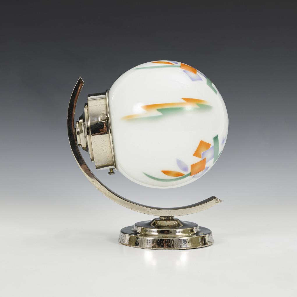 Sphere shade with screw socket on segmental arc arm. Wall mount with cut out cable guide, damage to chrome plating.