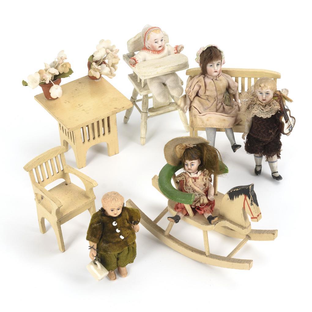 3-piece furniture set: bench, table and chair, rocking horse and high chair. In addition, 5 dolls made of bisque and celluloid. Traces of age, small defects.