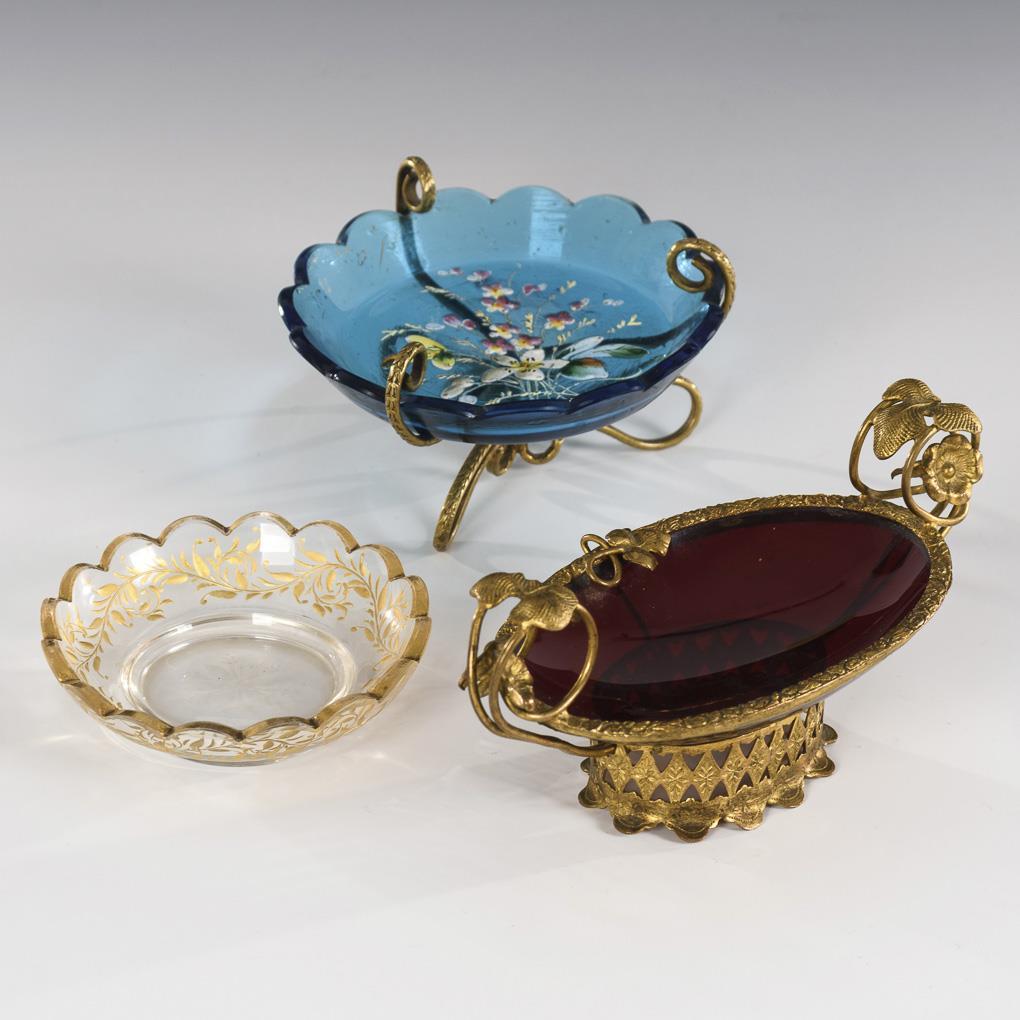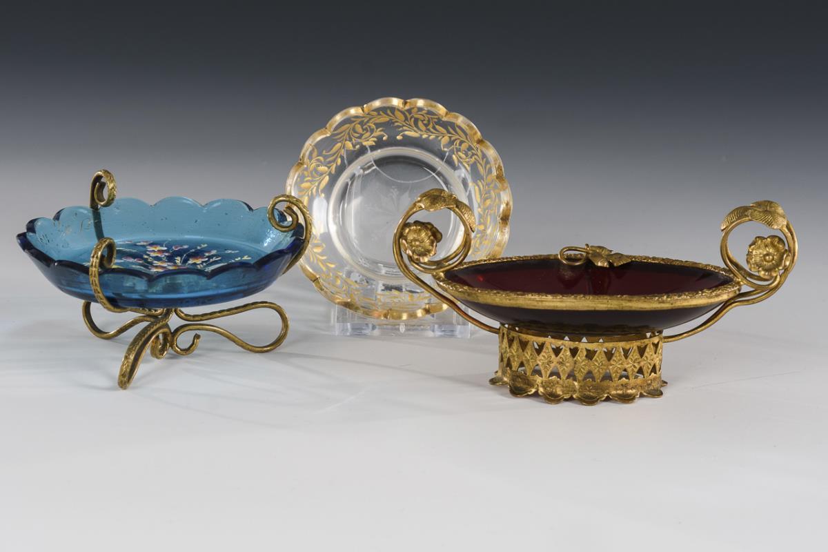 1x ruby glass bowl with filigree brass mounting (L 12 cm). / 1x Turquoise glass bowl with polychrome enamel painting and brass mount (Ø 8,5 cm). / 1x Josephinenhütte: bowl of colorless glass with vegetal gold painting (Ø 7 cm).