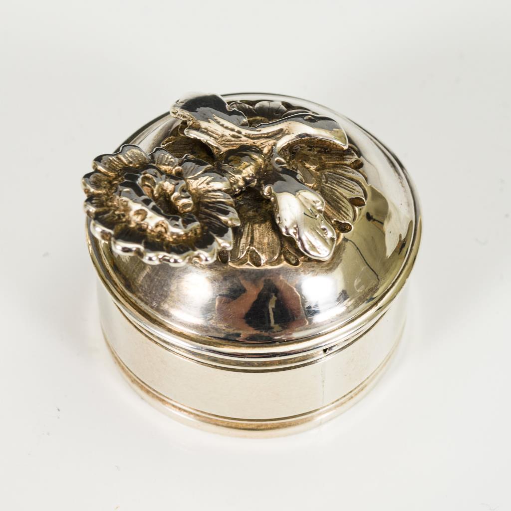 Balusterförmige Dose mit Blütenreliefs und plastischem Blütenknauf.