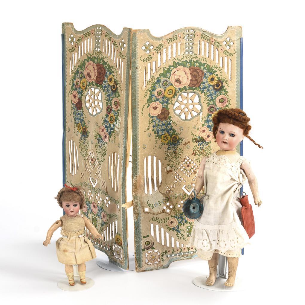 2 small Heubach dolls and art nouveau screen. 2x Ernst Heubach.