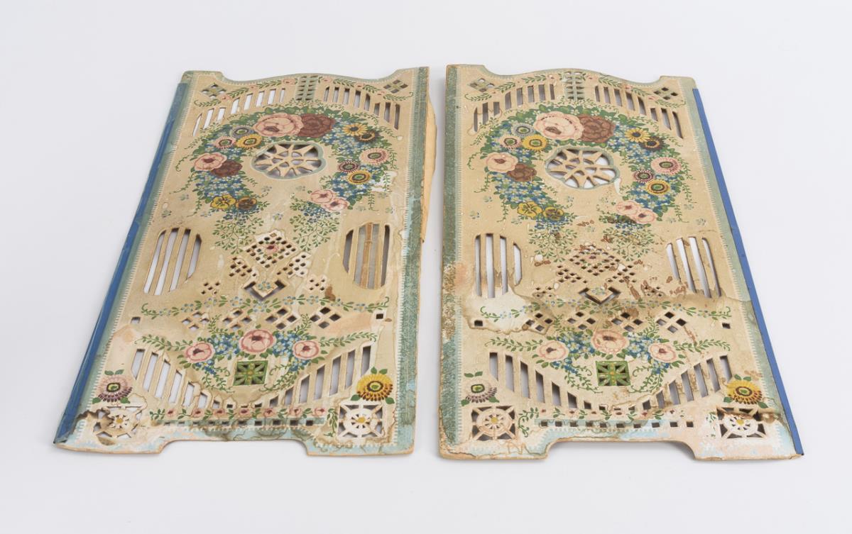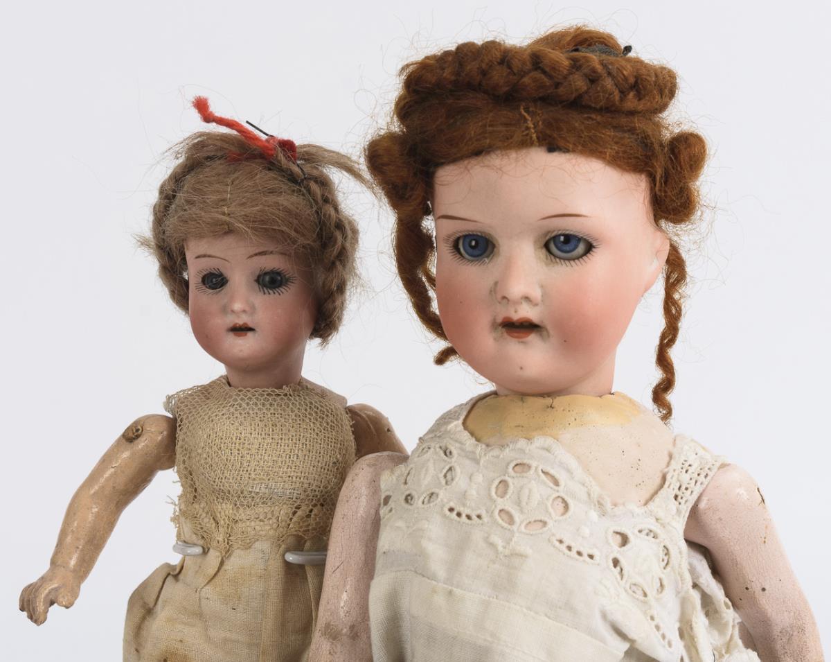 Both with crank head, blue sleeping eyes, mohair wig, 5-piece standing doll body and white undergarment. Defective screen of colored lithographed cardboard (51.5 x 51 cm). Dolls with defects, screen stained.
