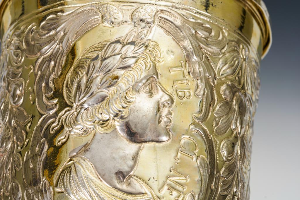 Reich reliefierter Becher mit 3 römischen Kaiserporträts in ovalen Blattkartuschen: Caesar, Tiberius und Octavius. Dazu floral reliefierter Deckel mit repariertem Kugelknauf. Auf 3 Kugelfüßen. Gedellt, 1 kleiner Riss am Mündungsrand, Füße gestaucht.