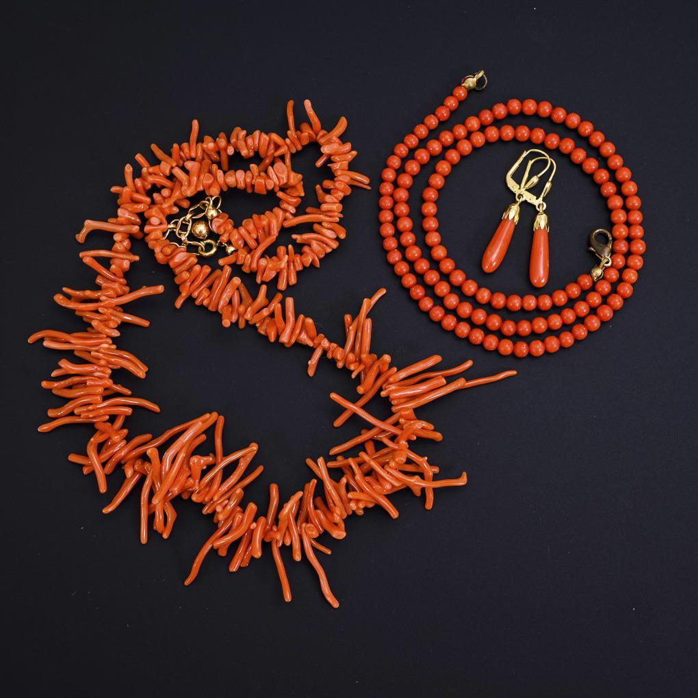 Split chain in progression, lace necklace and pair of earrings with corals. Ring spring clasp, metal carabiner and spring bail.