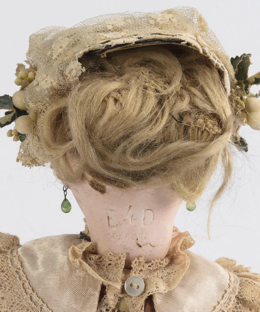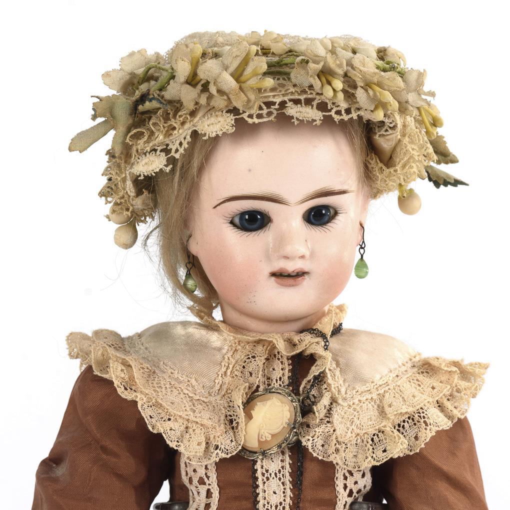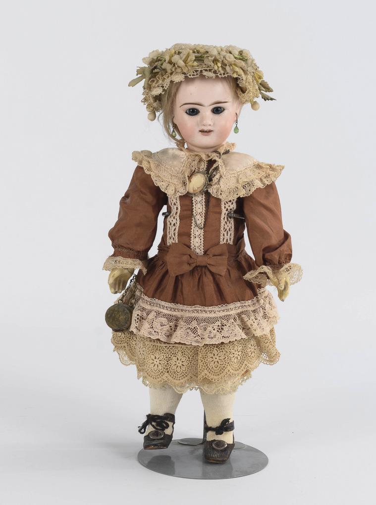 Crank head, fixed blue paperweight eyes, earrings, blond mohair wig remnant. 5-piece mass body. Brown silk dress with lace, black shoes, hood. Head x-rayed: without defects, only small chip at the right ear hole. Right foot probably old repaired, fingertips minimally bumped.