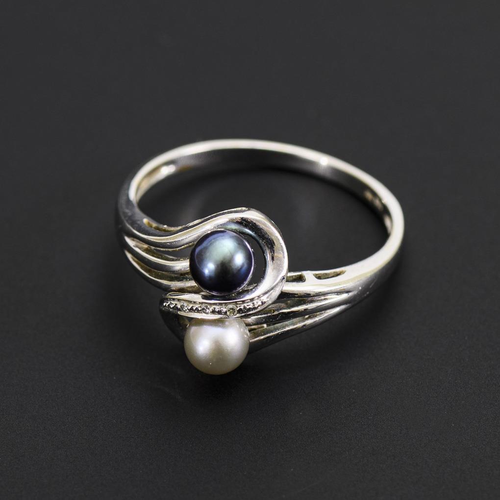 Dark and light cultured pearl and 3 small diamonds between narrow rail.