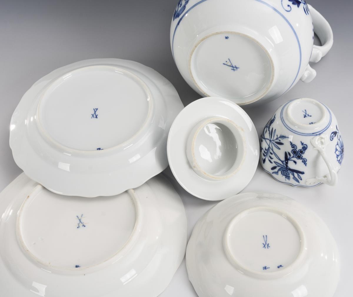 Form "New Cutout". Coffee pot (h 25 cm), 4 coffee cups (h 6 cm), 2 saucers, 3 cake plates and 3 breakfast plates. Lid noses of the pot lid missing, rose knob bumped, chip on 1 cup rim, small burn crack on 1 cup rim.