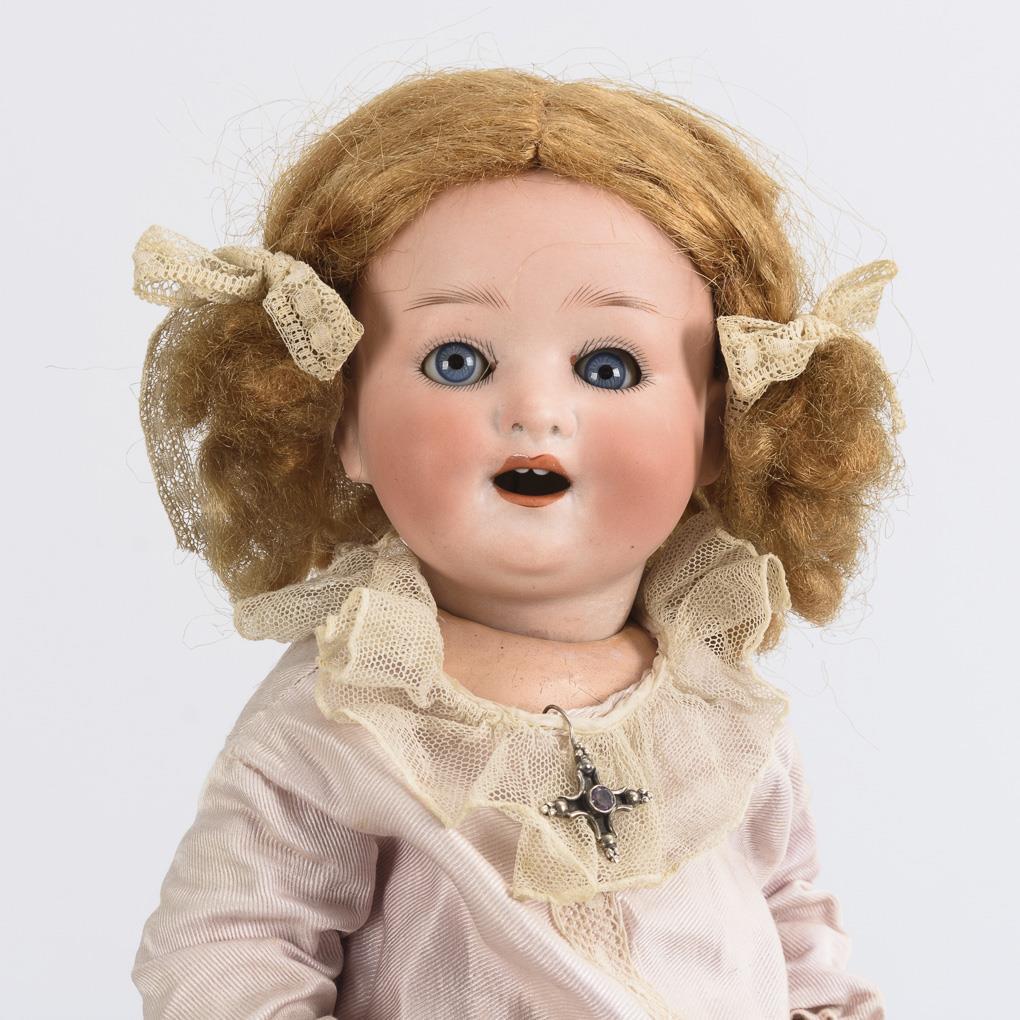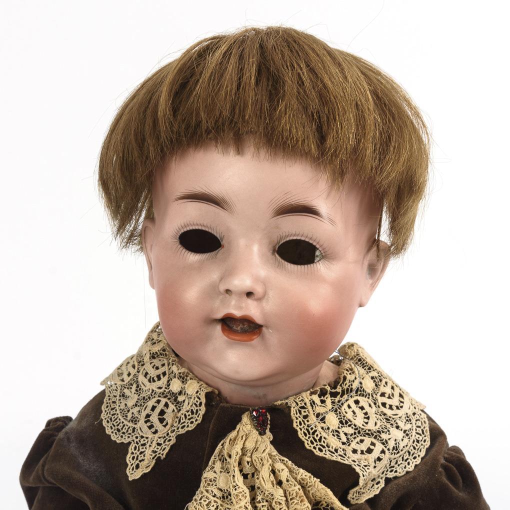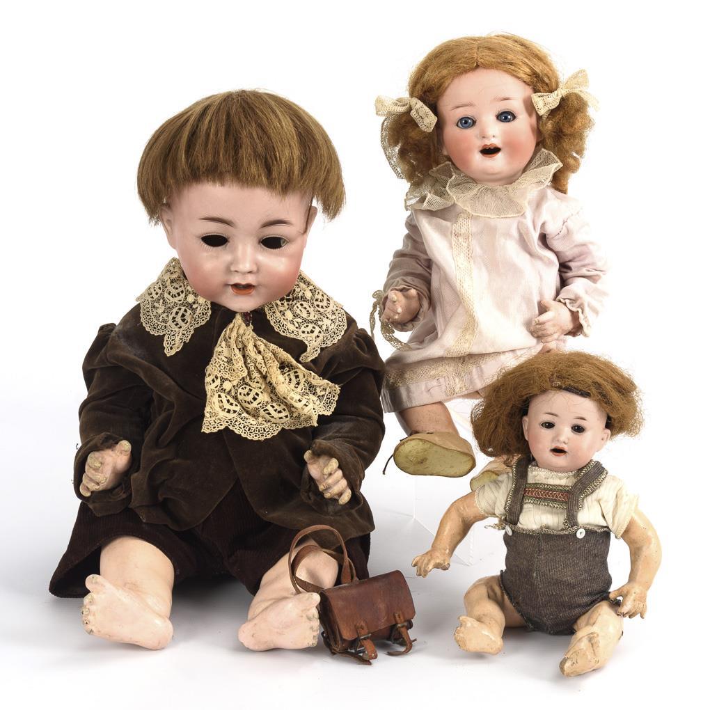 All with crank head, wig and 5-piece baby body. 2x with brown pants, 1x light pink dress. 2 heads x-rayed: without defects. 1x without eyes. 1x head not X-rayed: Burn crack on the neck crank, eyes a little sunken. Body with defects.
