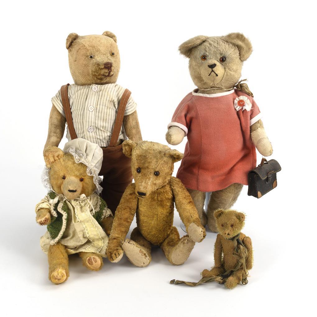 5 old teddy bears.