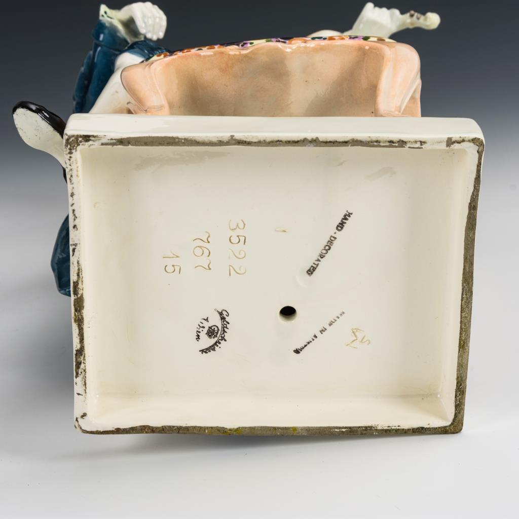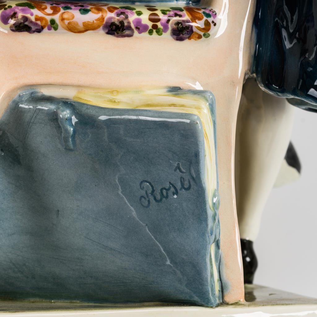 Auf der Lehne eines Barockstuhls sitzender Mann mit Violine, auf Quadratsockel. Ohne Geigenbogen.