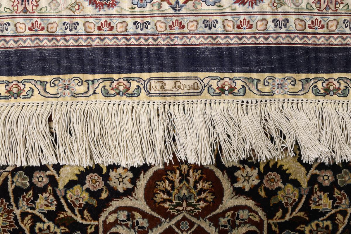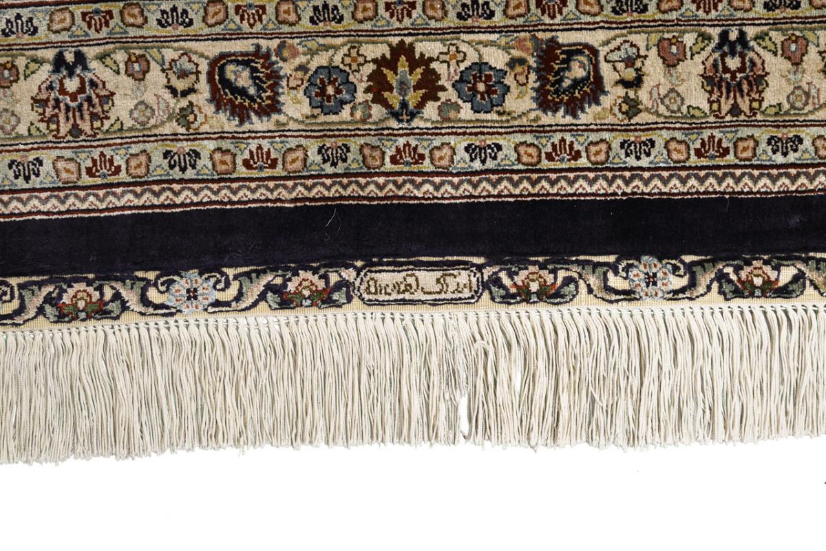 Eight-panel floral medallion on curved midnight blue mirror with elaborate floral decoration, islimis and palmettes. Multi-row border with Shah Abbas palmettes. Kilim finishes with knotted floral tendrils, knotted fringes.