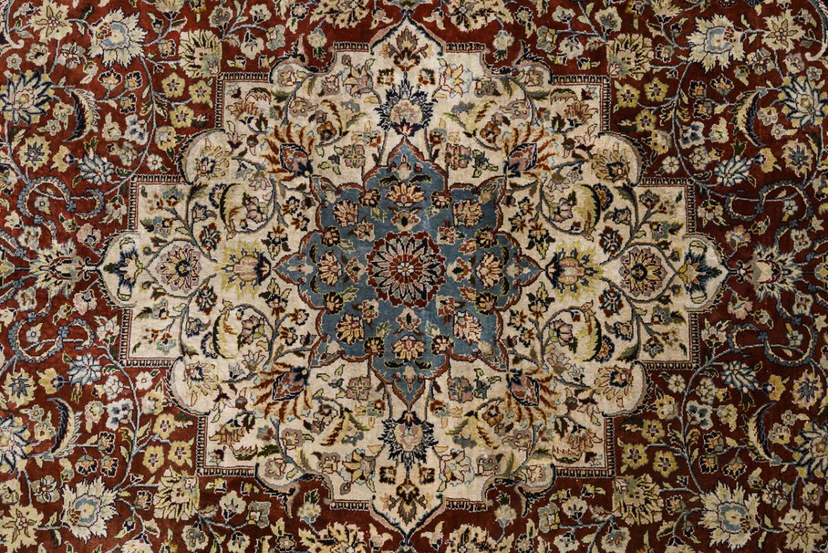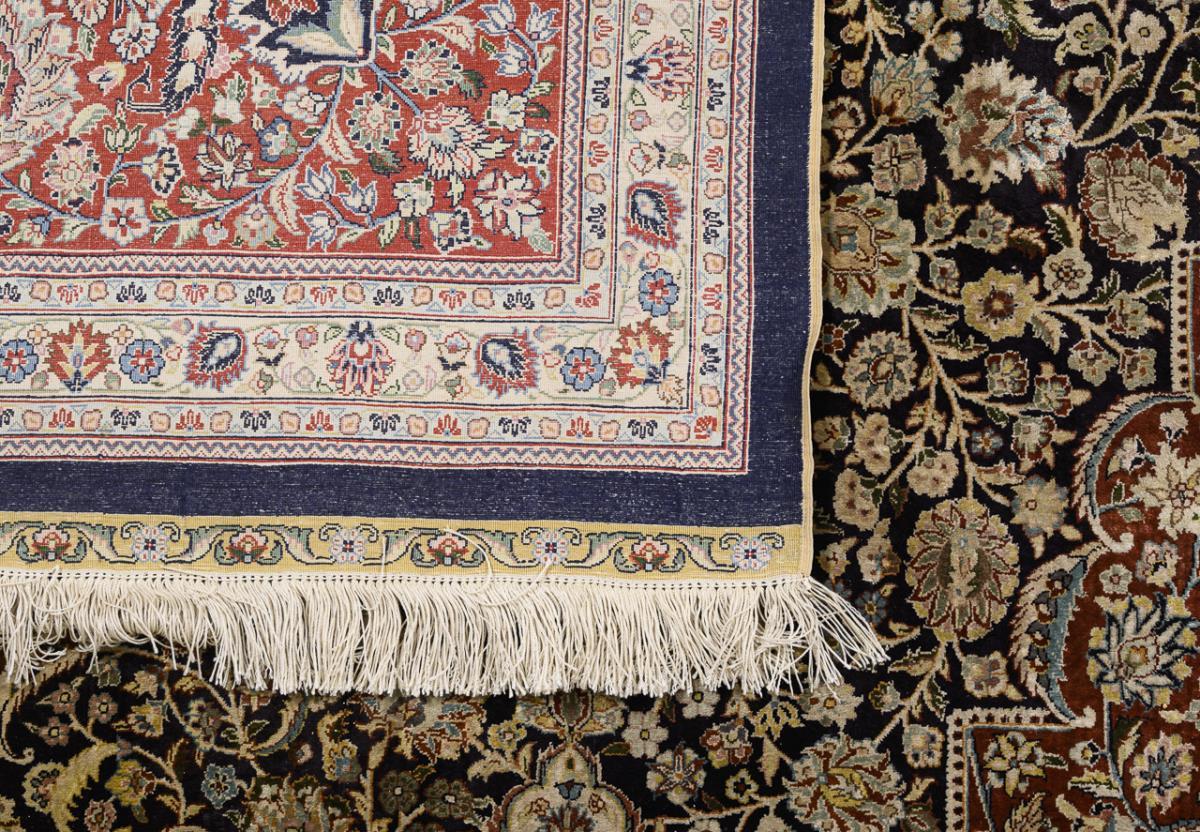 Silk on silk, extremely fine weave with about 1 million knots per square meter. Polychrome decoration with predominantly red, blue and ivory. Approx 245 x 310 cm.