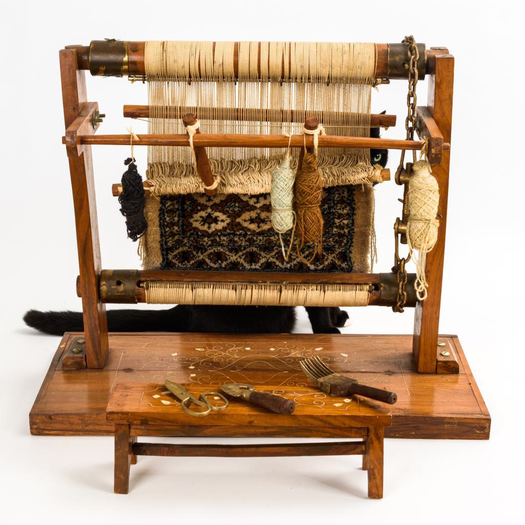 Webstuhl mit Ornament-Fadeneinlagen sowie begonnenem Teppich. Dazugehöriges Bänkchen und 3 Werkzeuge. Minimale Alters-/Gebrauchsspuren.