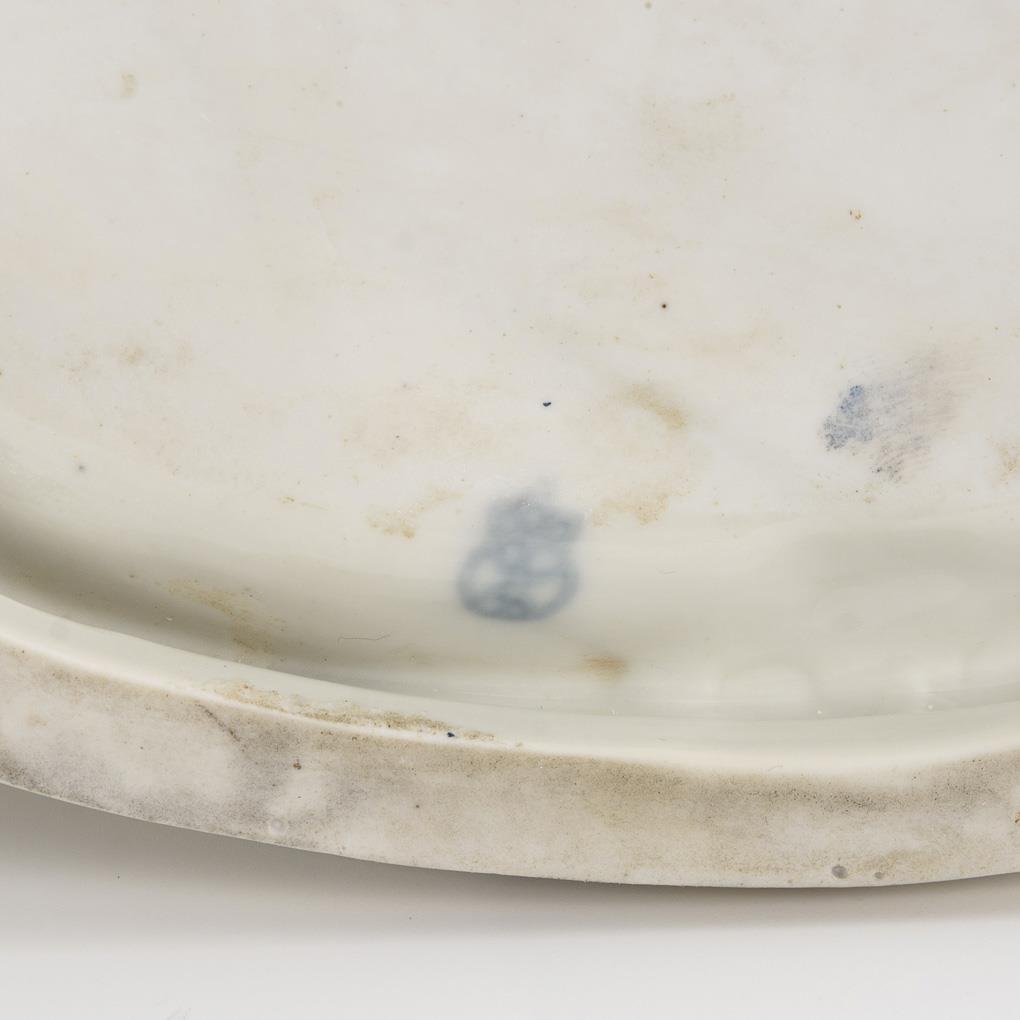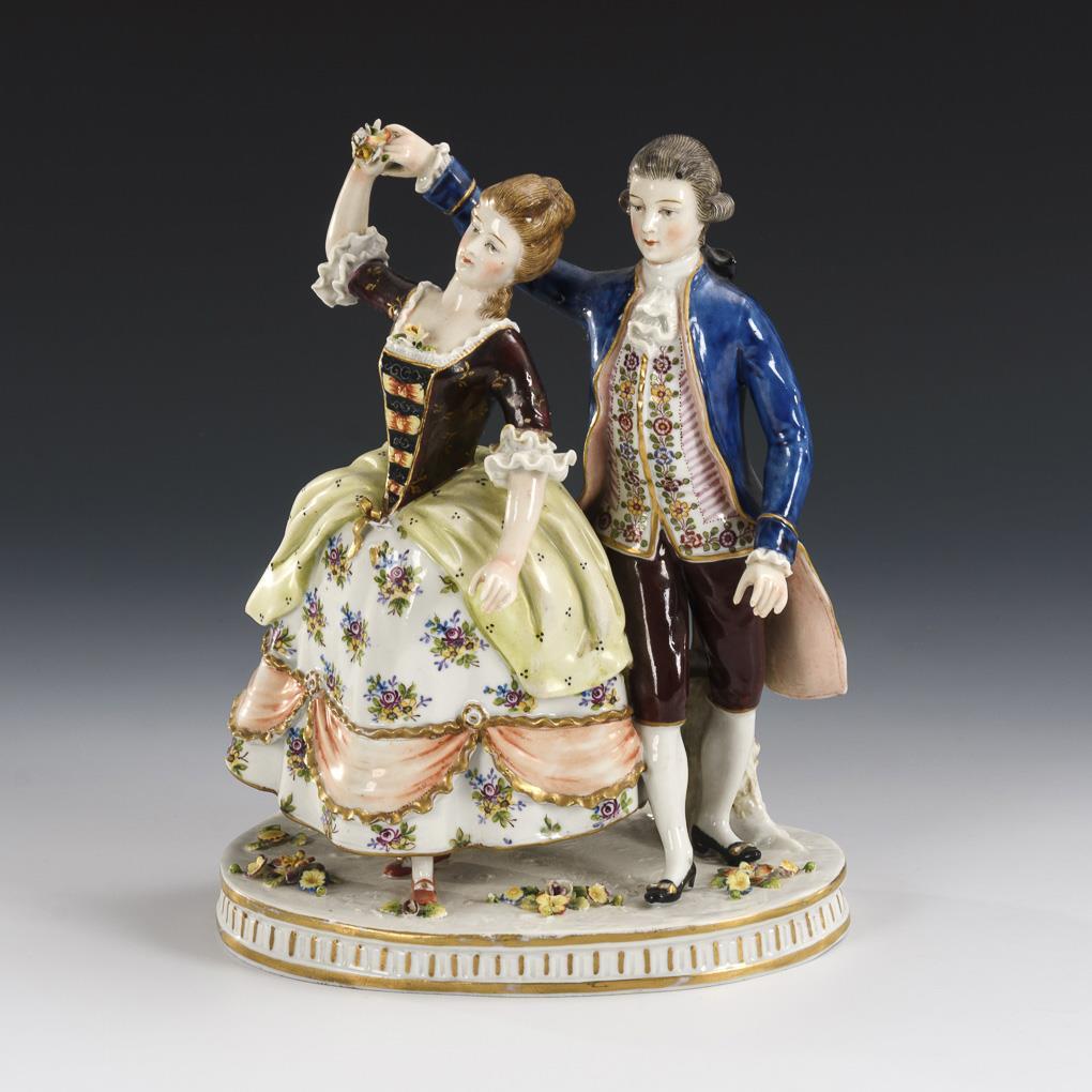 Rococo couple dancing together. Flower partially bumped, left arm of the dancer glued, minimal bumping on the edge of the base.