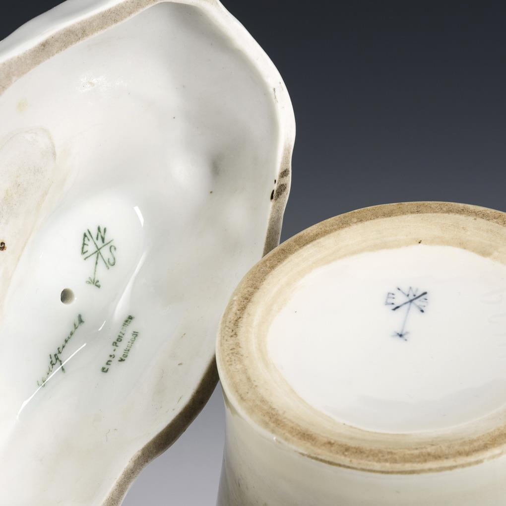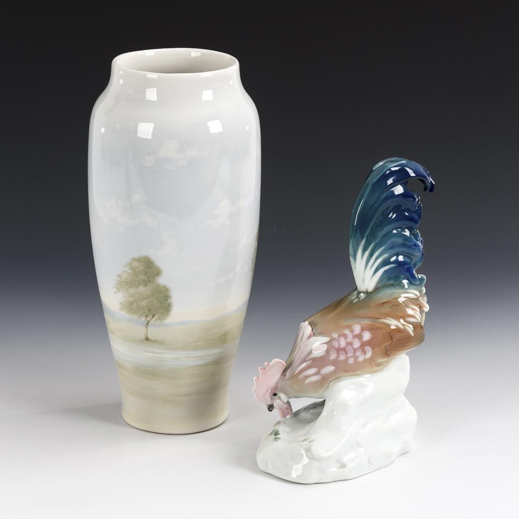 1x baluster vase with the surrounding painted depiction of a landscape with a pond, small rock with a summit cross and boy (h 29,5 cm). / 1x inscribed "A. Berger" (= design by Anton Büschelberger): pecking rooster on a natural base (h 23 cm).