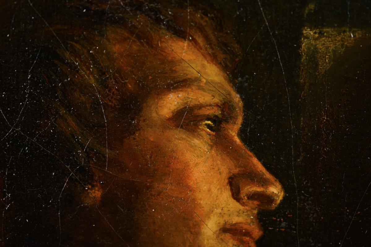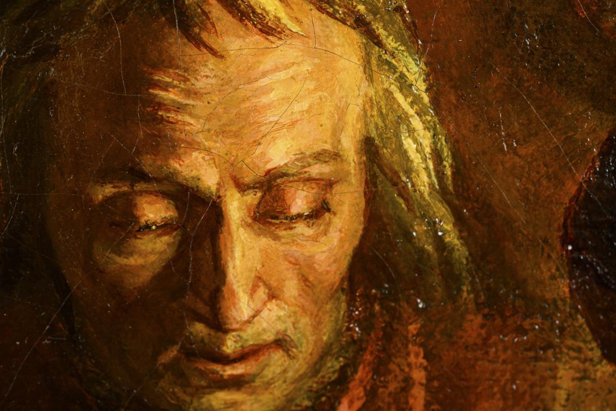 The family together at the table next to the fireplace devoutly listening to the words of the father, who reads from a book. Traces of age, little retouched.