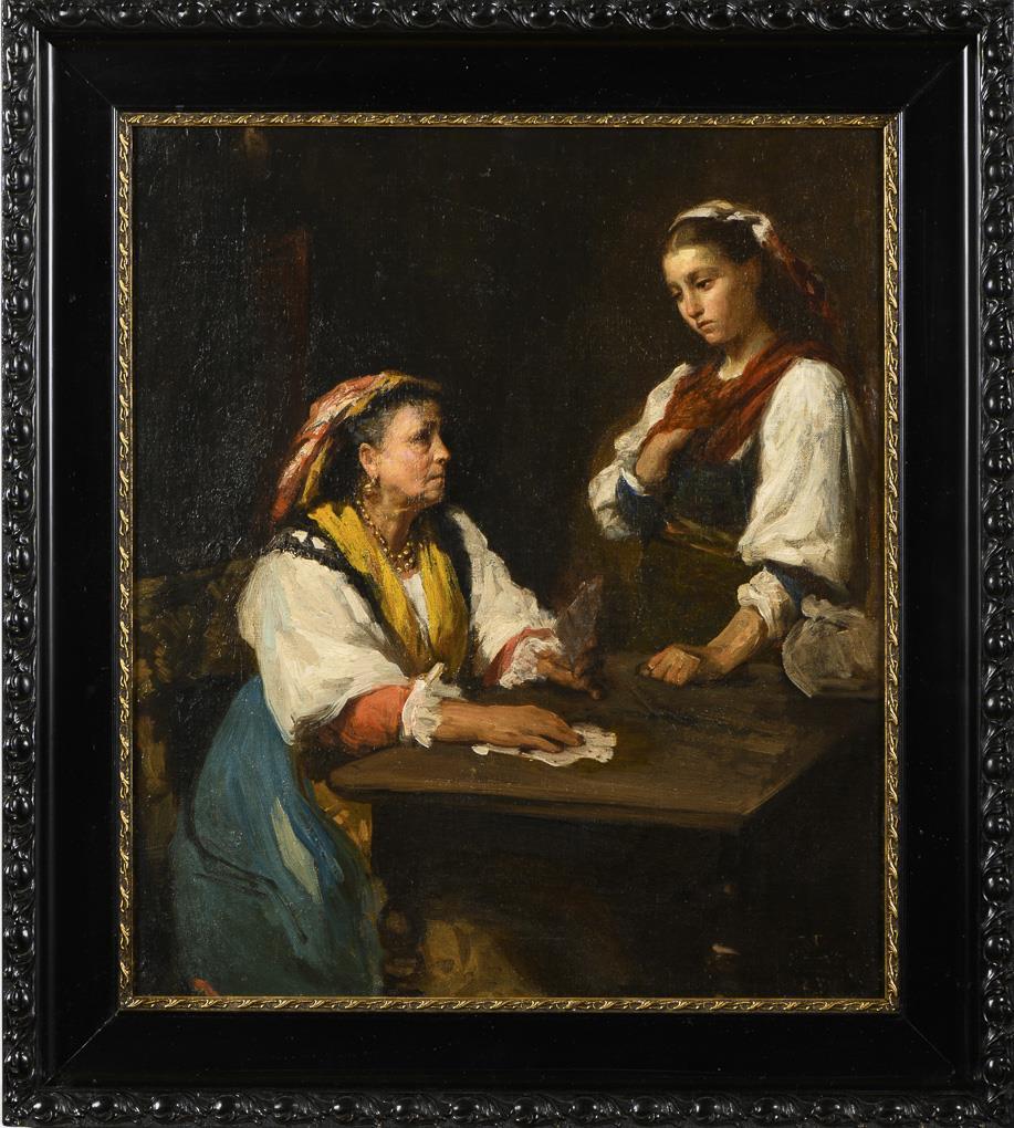 Young woman in the parlor with the fortune teller at the table. Slight signs of age.