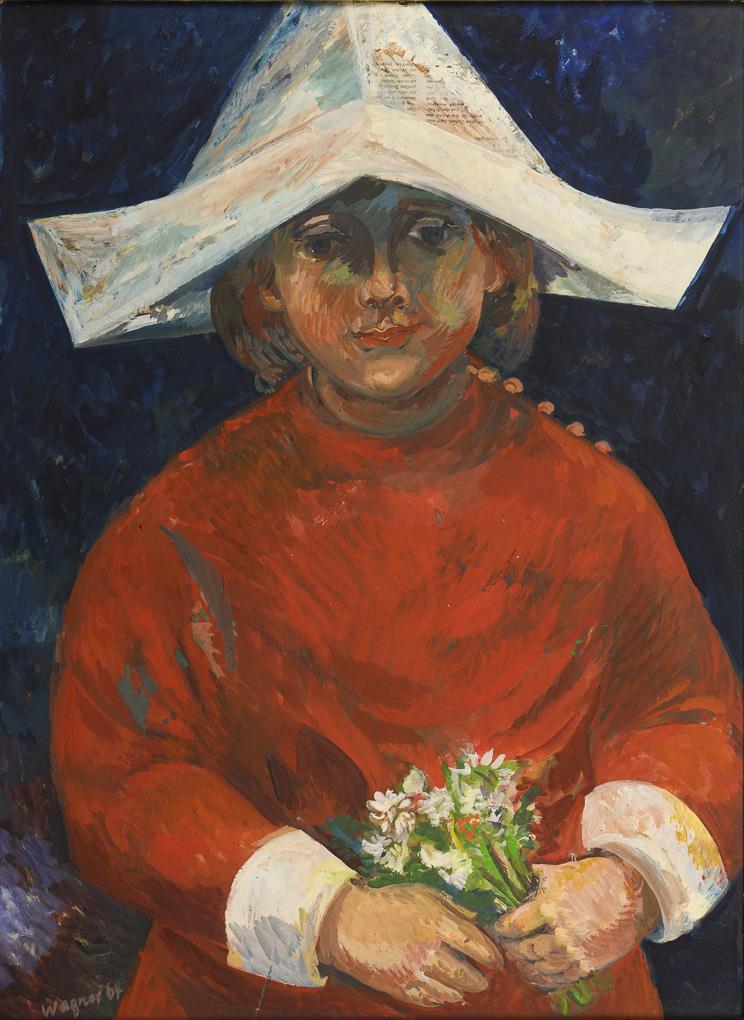 The child in red clothes with folded newspaper hat and small bouquet of flowers against a blue background.