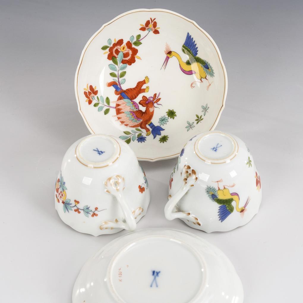 Form "New Cutout". 1x cup and saucer with Indian floral painting, 1x cup and saucer with crane and Korean lion. 1x glued chip on the rim of the cup.