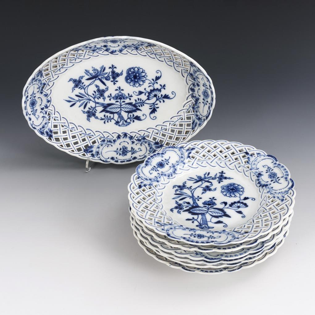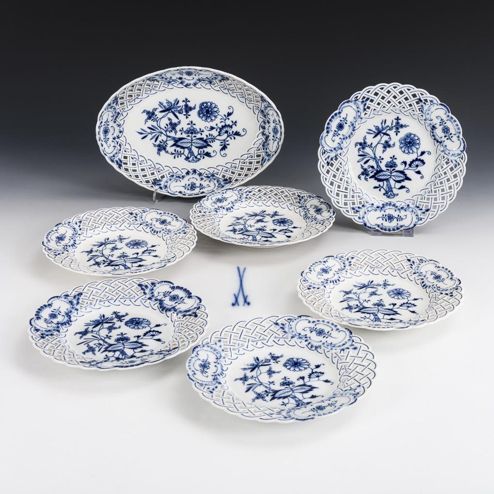 1 onion pattern breakthrough bowl and 6 -breakthrough plates. Meissen.