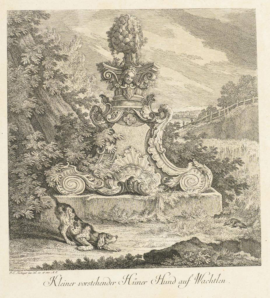 4 depictions of dogs hunting: "Protruding dog in front of a hare in camp." | "Protruding dog on pheasants." | "Large protruding hound dog on Reb Hüner." and "Small protruding hound dog on quails."; No. 101 - 104 in Georg Thienemann's "Life and Work of the incomparable animal painter and engraver Johann Elias Ridinger [...]", 1856. Parts somewhat foxing.