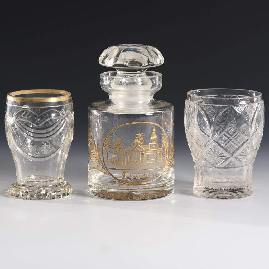 1x cylindrical decanter with a view of Landeck/Silesia on the front, decorated in gold (stopper added; h 15,5 cm). / 2x different cups with notch, Steinel and surface cut decoration. Gold rubbed.